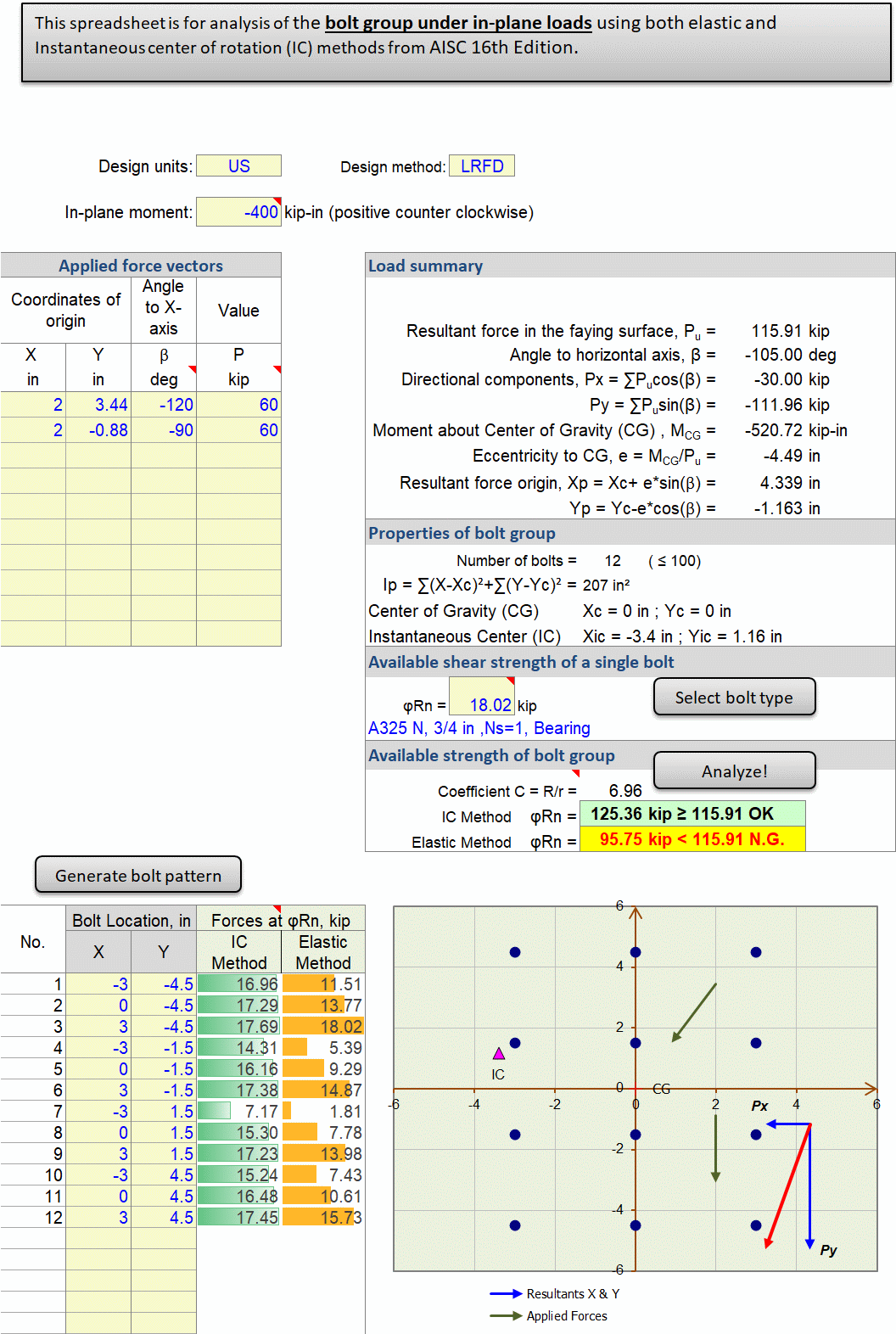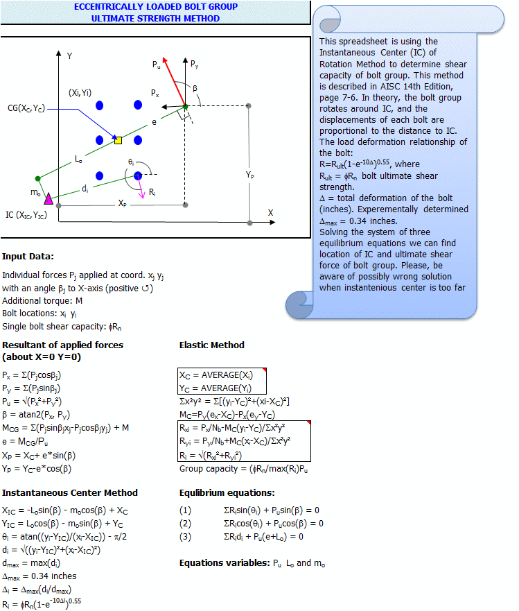 BoltGroup calculates the shear capacity of eccentric bolted connections using the AISC 16th Edition instantaneous center of rotation method (LRFD). Handling simultaneous in-plane forces and moment, it is ideal for design of gusset plates and girder splices.
